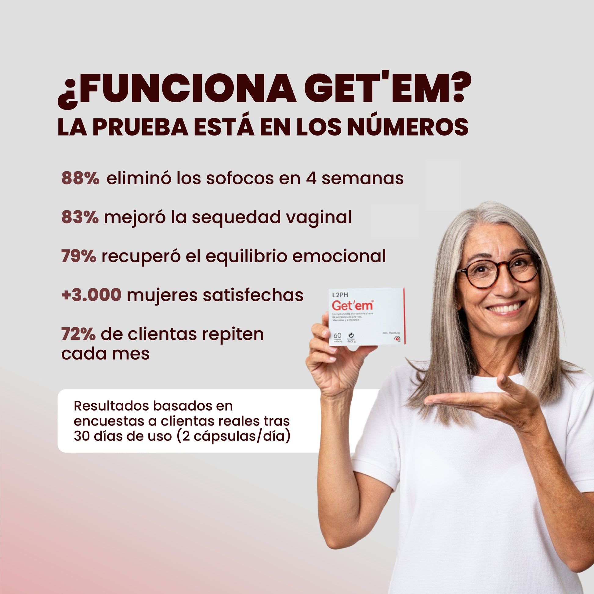 LLevo como 8 o 9 meses tomando Get´em+Linaval+Benavist Forte, mi problema principal es sequedad ocular y sofocos, y en mi caso funciona muy bien, llevo provado muchos sobre todo por el tema de la sequedad ocular y nada me fue tan efectivo como este tratamiento, yo recomiendo tomarlo tres meses y dejarlo un mes, es la manera de darse cuenta que realmente funciona, porq uno se acostumbra a los resultados y no es consciente que se lo debemos al los productos, hasta que lo dejas y te das cuenta que vuelves a los sintomas de antes, todo tratamiento necesita un tiempo para ver resultados y desde luego que cumple con lo que promete, me da rabia los comentarios negativos cuando solo llevas dos o tres semanas probando el producto este o cualquier otro, y ya quieres un milagro, hay que ser constante y realistas con las expectativas, decir tambien que mi piel y pelo mejoro muchisimo. Compré el pack para problemas de retención y peso que todavia no empece, me voy a poner a ello y ya contare mi experiencia, gracias