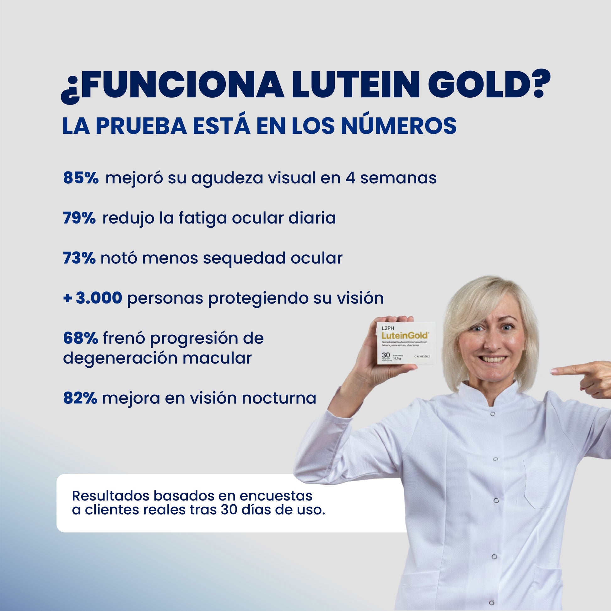 LuteinGold son cápsulas que contienen Luteína purificada, Zeaxantina, Zinc, Selenio, Cobre, Manganeso, complejo vitamínico B completo y vitaminas C y E que reducen el riesgo y la progresión de la Deg. Macular, protegiendo la mácula y la retina frente a la luz azul y el estrés oxidativo. Sus componentes con propiedades antioxidantes oculares tienen capacidad para prevenir y frenar la pérdida de visión cataratas, presbicia o vista cansada, miopía, astigmatismo, etc. Reduce los niveles de homocisteína en sangre. Niveles altos de homocisteína aceleran la progresión de patologías oculares. Sus efectos antienvejecimiento son claves para contrarrestar el daño ocular.