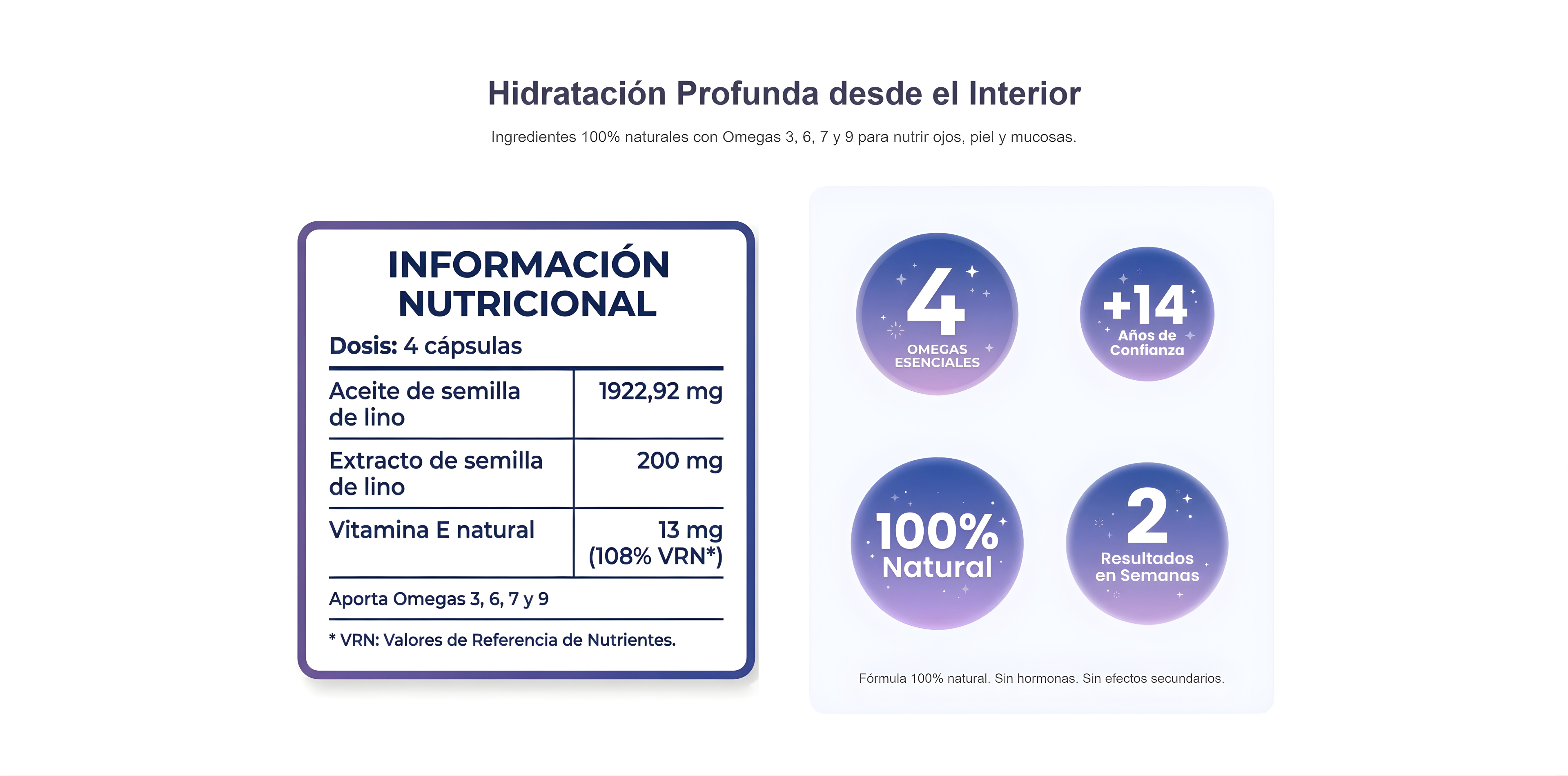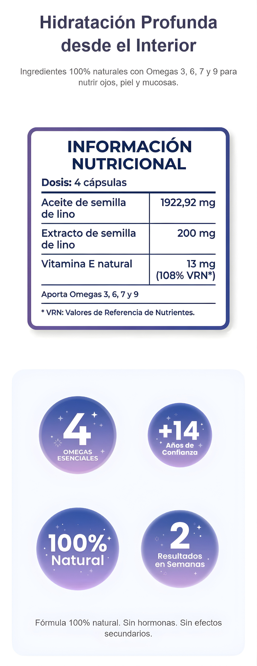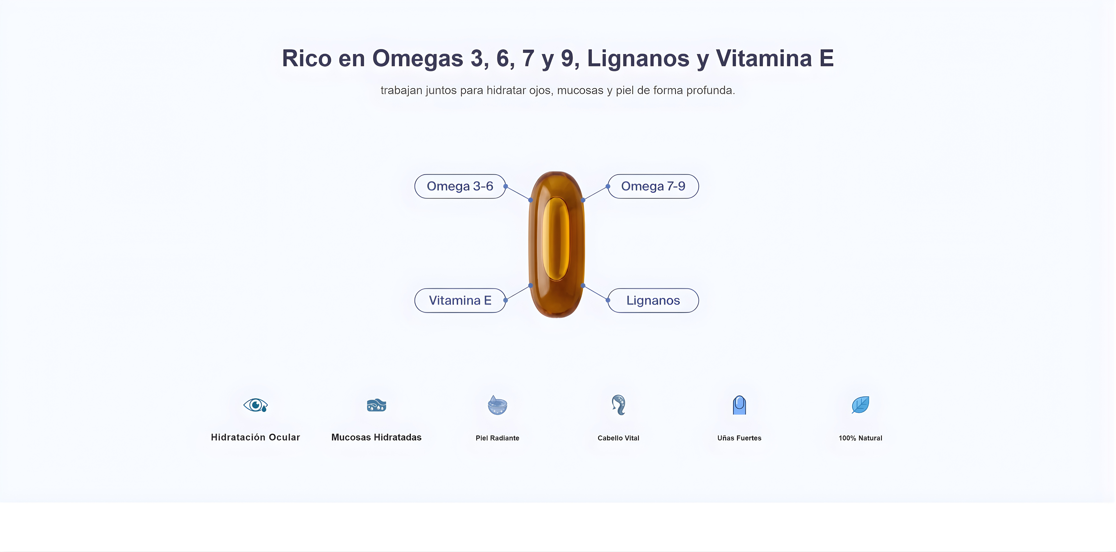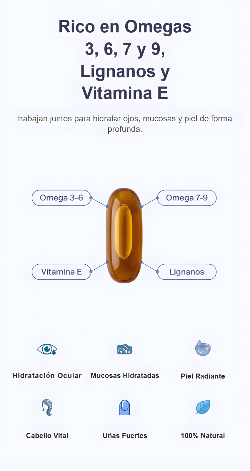 Formulado a base de aceite y extracto de semillas de lino, actúa sobre ojos, mucosas (vaginal, bucal, urinaria), piel, cabello y uñas, ayudando a restaurar el equilibrio natural de hidratación.